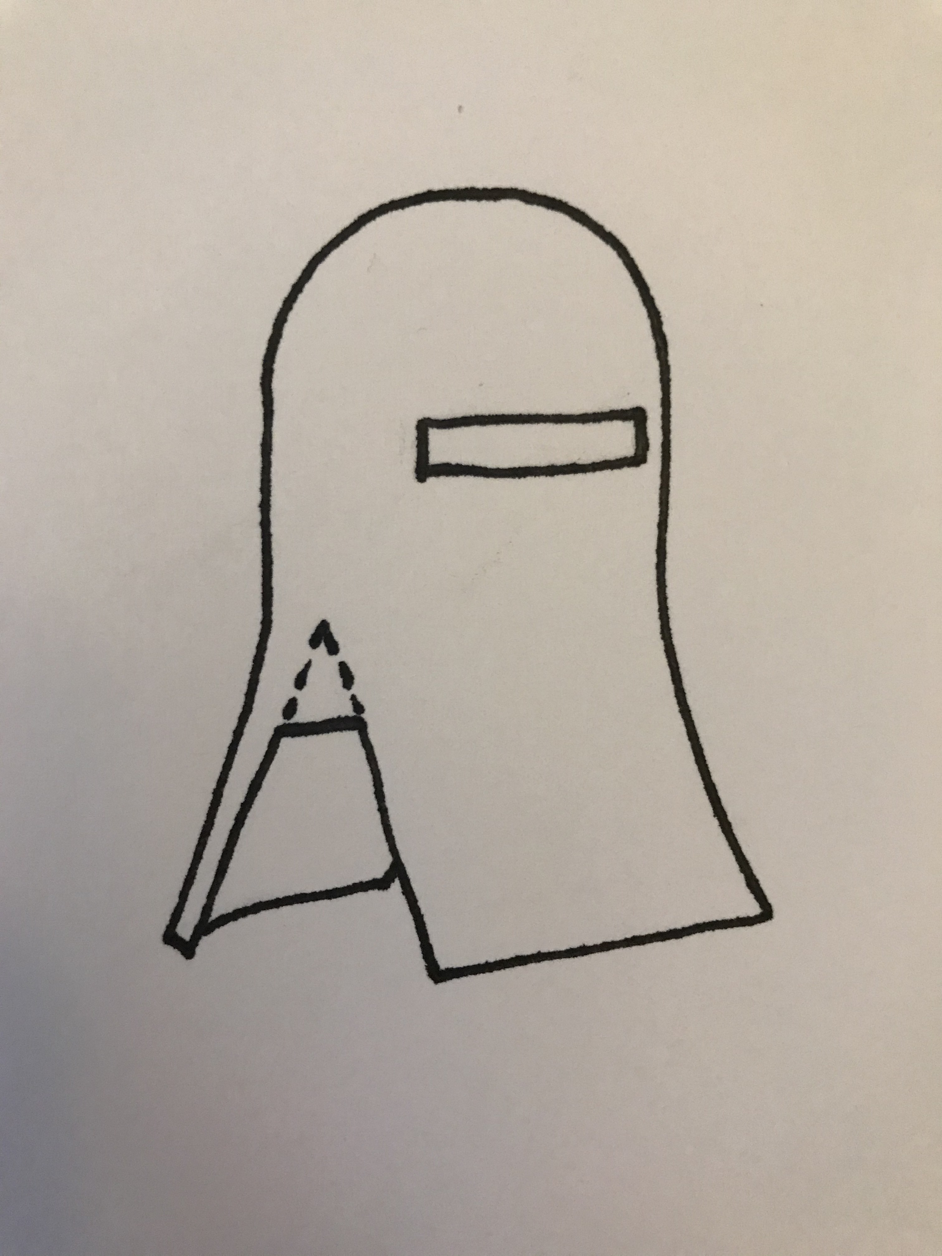 The construction of these hood is very simple. From the spherical top, it is just a tube. The face opening is created by a couple of rows are omitted. This simple solution works very well with the adjustable mail. When put on the mail form an oval opening around the face. The mail falls in under the chin making a pretty tight fit. The collar is made with just slits at the shoulder with a small wedge.